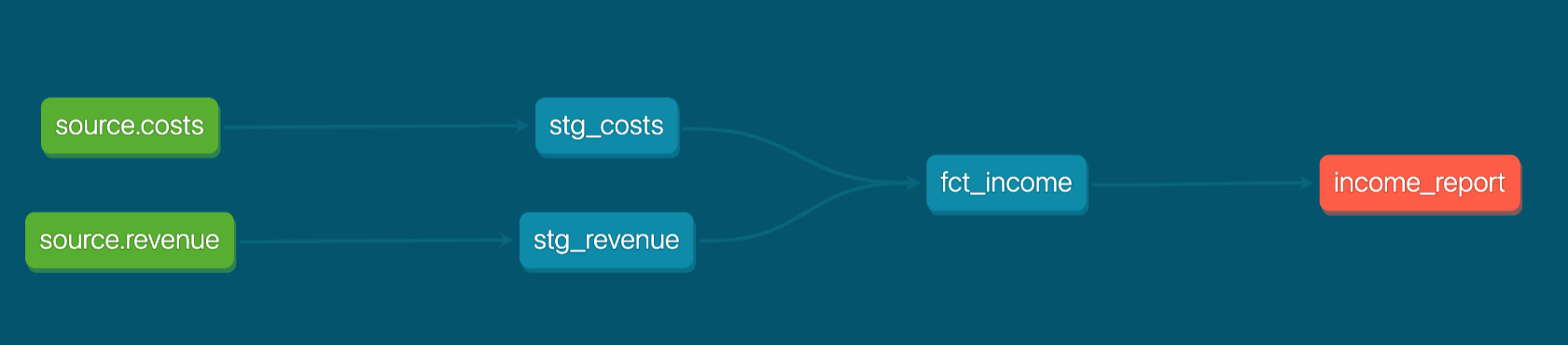 You can imagine her DAG as shown below, where fct_income captures income per month for each product category.